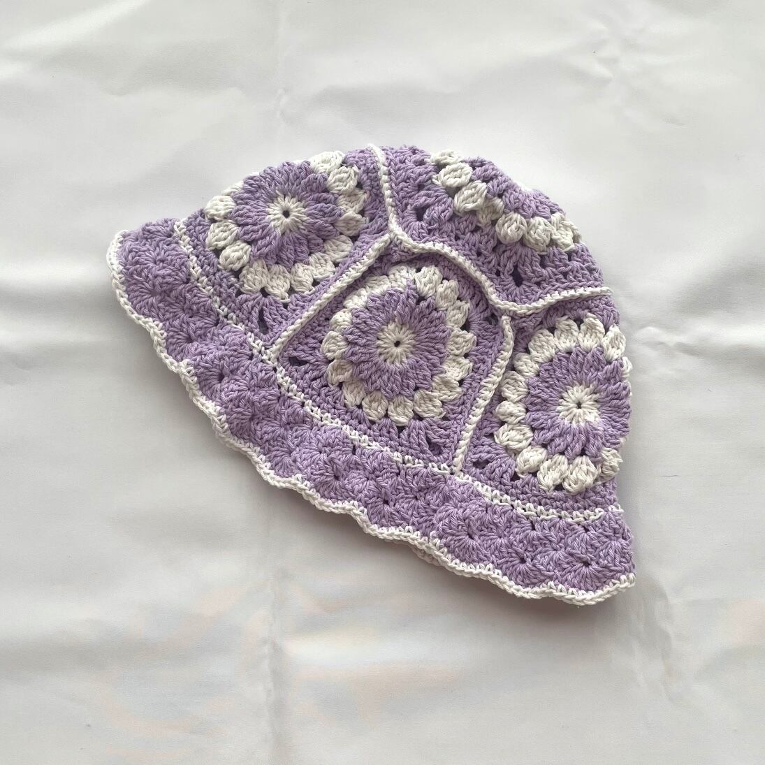 [H50]手編みバケットハット グラニースクエア(purple/white)